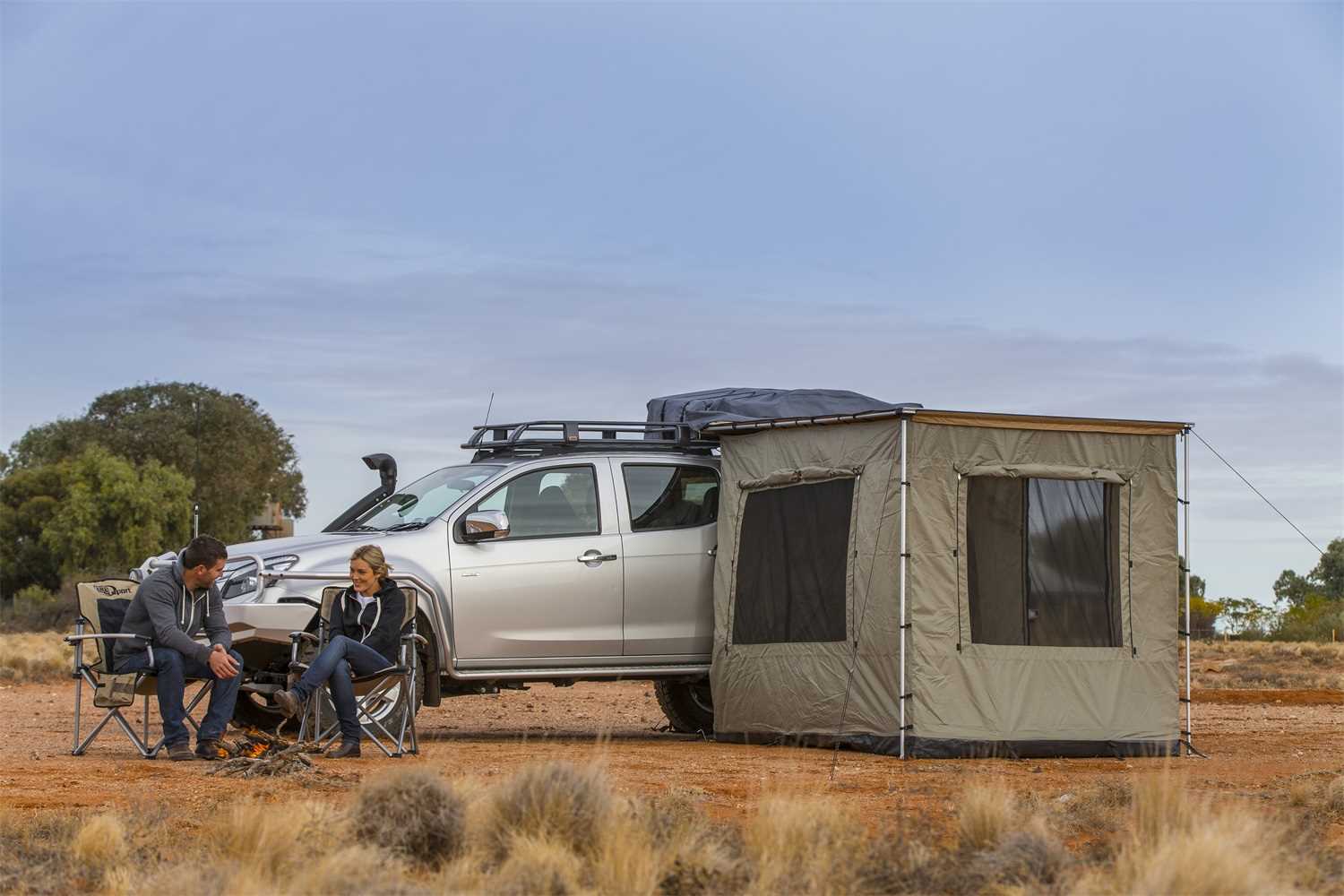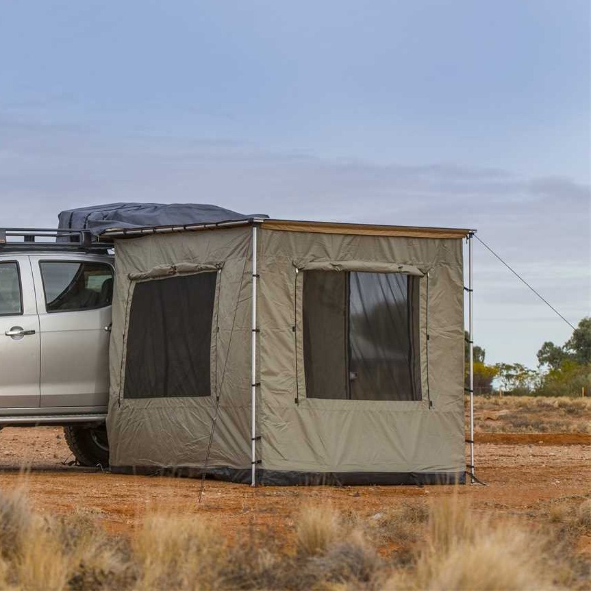 Sidevegger med gulv til ARB awning/markise som er 2,5 meter lang. Ruller du opp vinduene kan du fortsatt sitte fri for mygg takket være myggnetting på alle åpne flater.