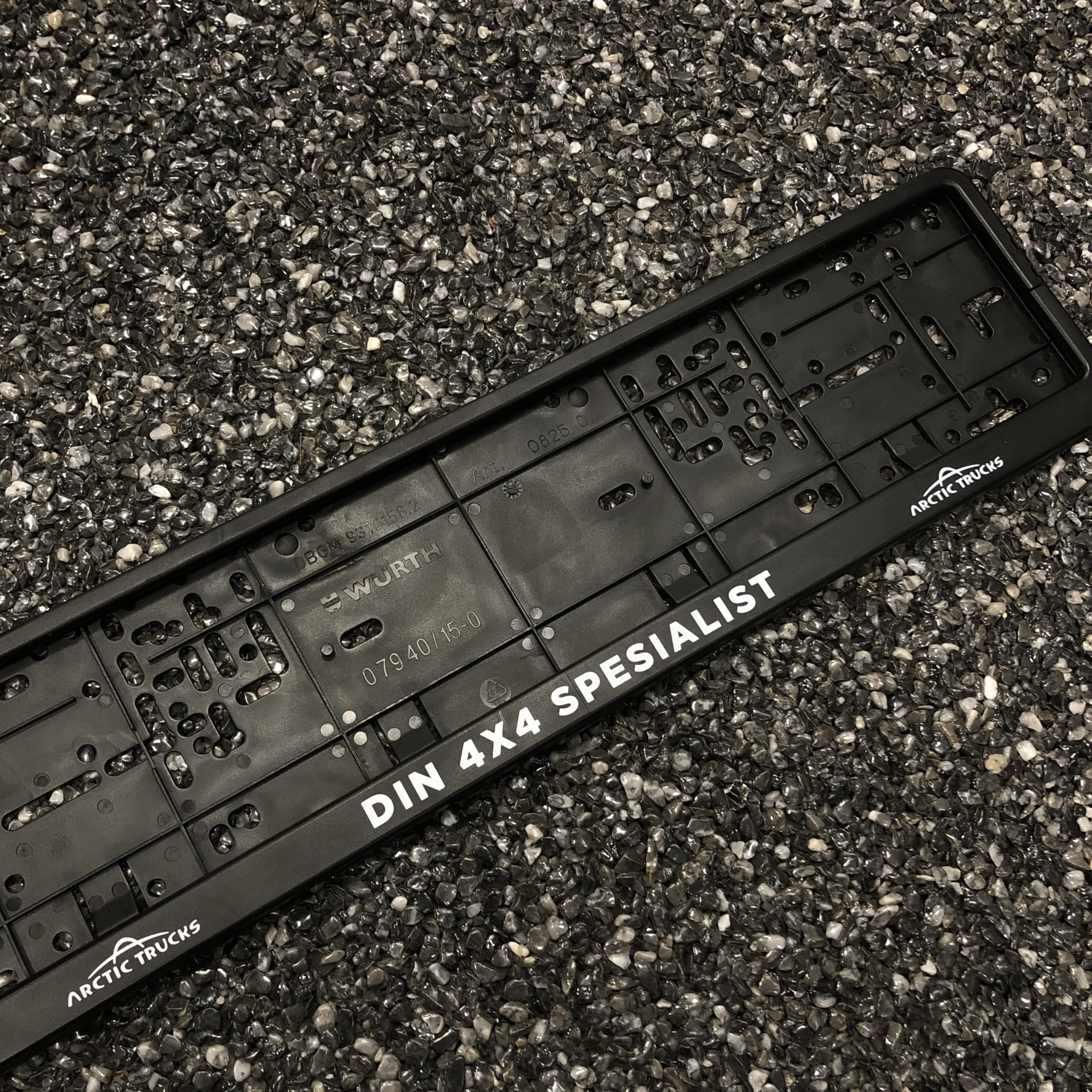 Våre originale skiltplateholdere med DIN 4X4 SPESIALIST trykket på i hvitt.