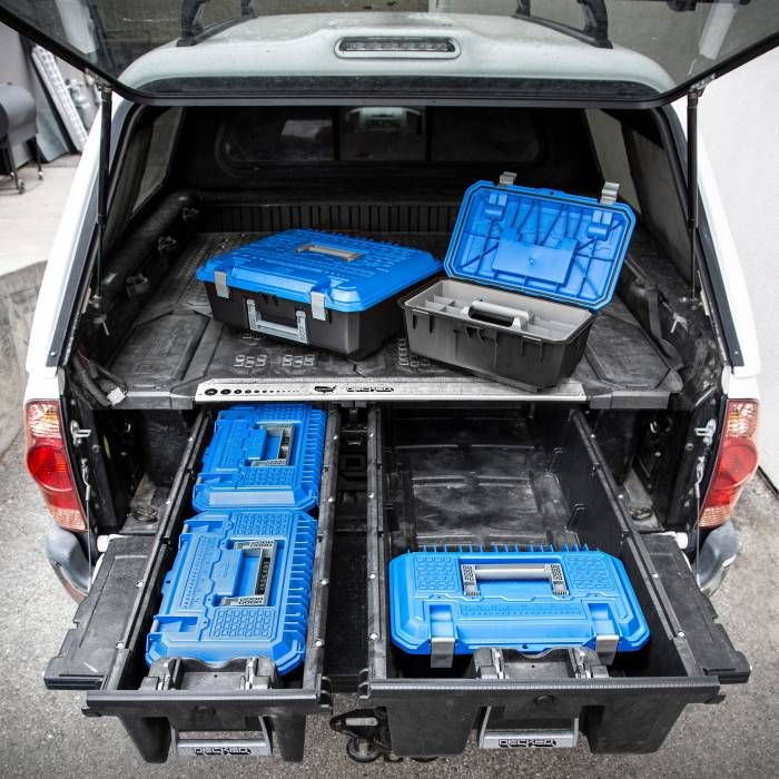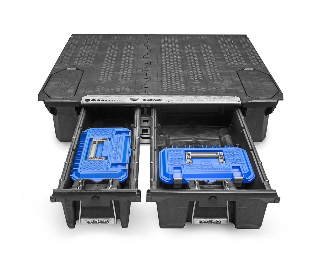 DECKED Crossbox verktøykasse er en verktøykasse som er ca halvparten av størrelsen til storebroren. Passer i begge skuffstørrelsene i hver sin retning. Laget i robust plastmateriale som