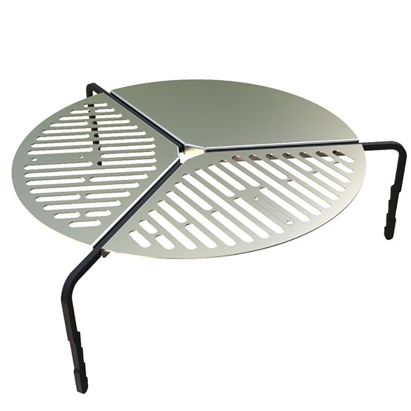 Genial grillrist og stekeplate til å legge over leirbålet. Laget av tre rustfrie stålplater som er skrudd sammen med tre ben av støpejern. Oppbevares på reservedekket. Gassgrill sier du?